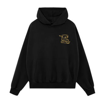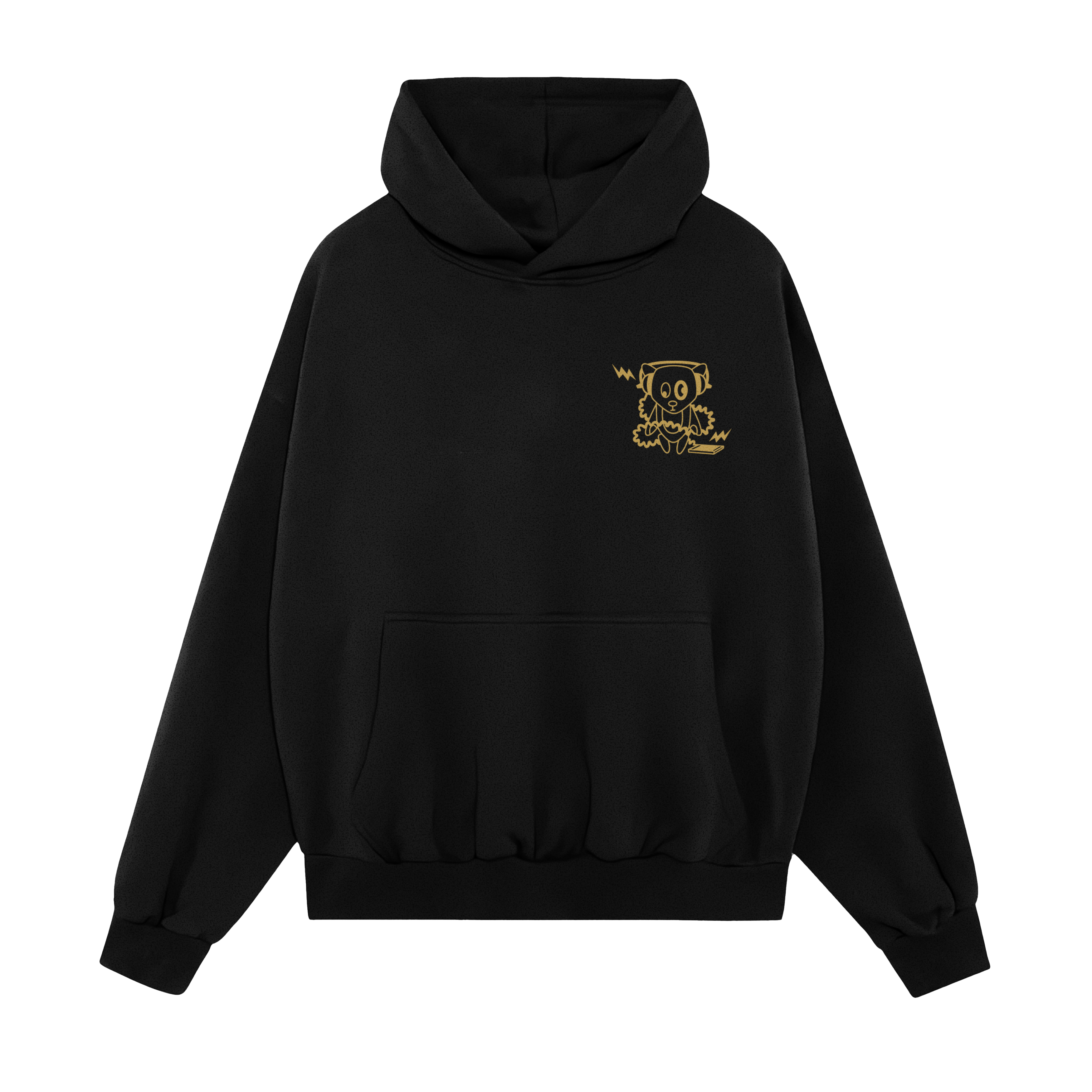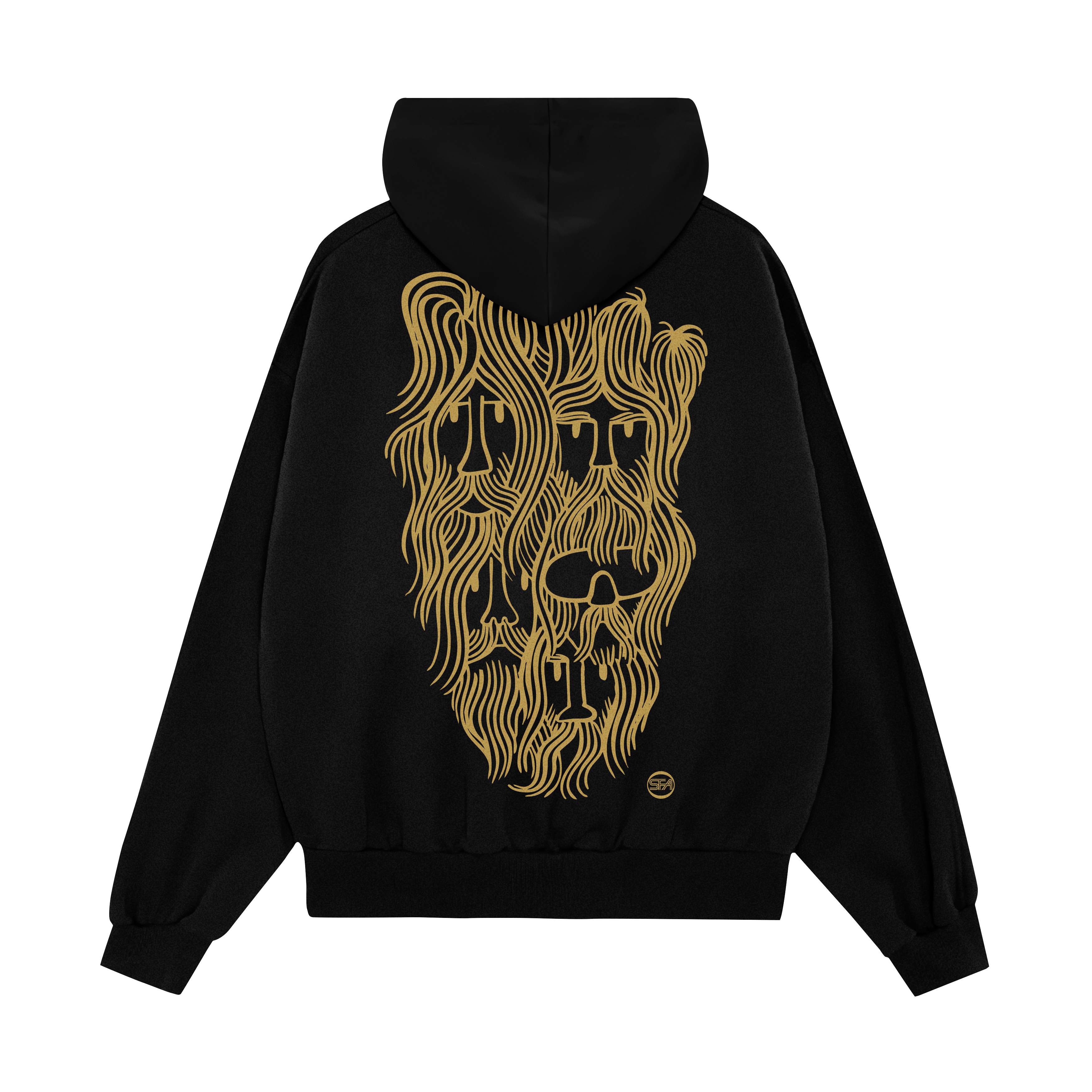 Super Furry Animals 'Furry Faces Logo' hoodie in black featuring illustrations by Pete Fowler, originally used for the 'SFA at the BBC' box set design, in gold on the front and back.