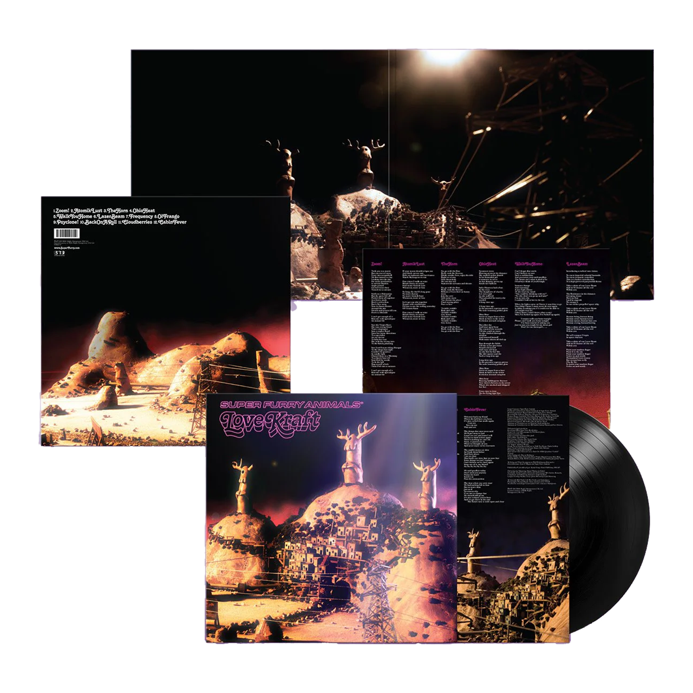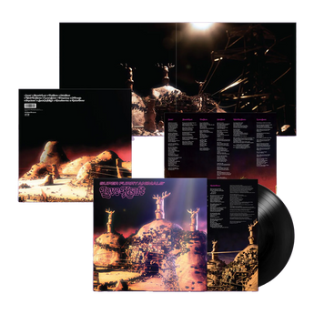 Updated packaging features the original, meticulously built diorama design by long-time collaborator Pete Fowler. Constructed by hand in his studio, complete with bulb-lit illumination, then photographed, the sleeve’s depiction of a monolith-rich desert landscape reflects the sense of other space and time depicted by Love Kraft’s woozy songs. The final sleeve design again comes courtesy of Mark James.